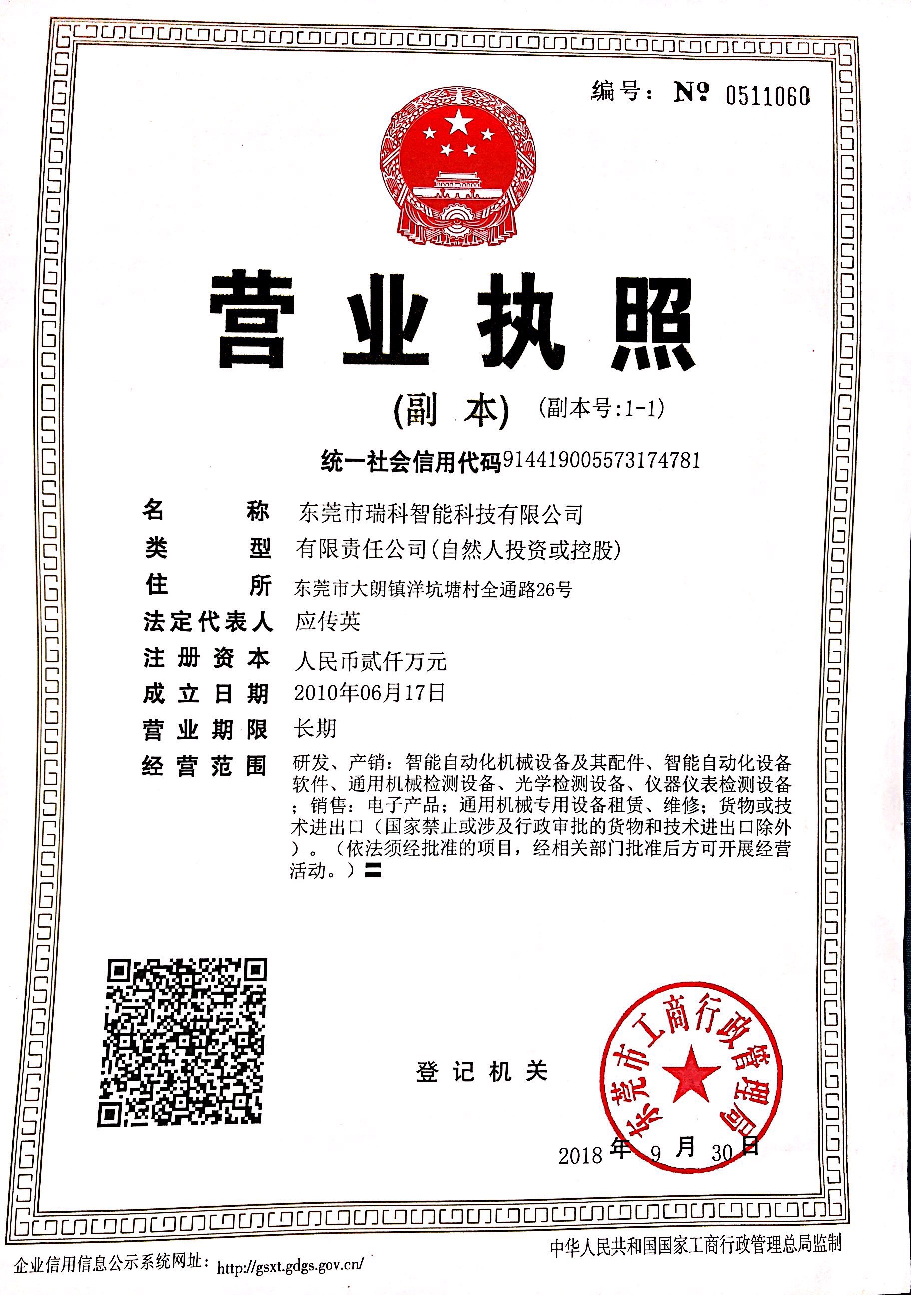 2018年9月30號,東莞市瑞科智能科技有限公司獲得東莞市工商行政管理局注冊成功的新營業執照,東莞市瑞科自動化設備有限公司正式更名為東莞市瑞科智能科技有限公司,標志著瑞科又發展到一個新的高度。