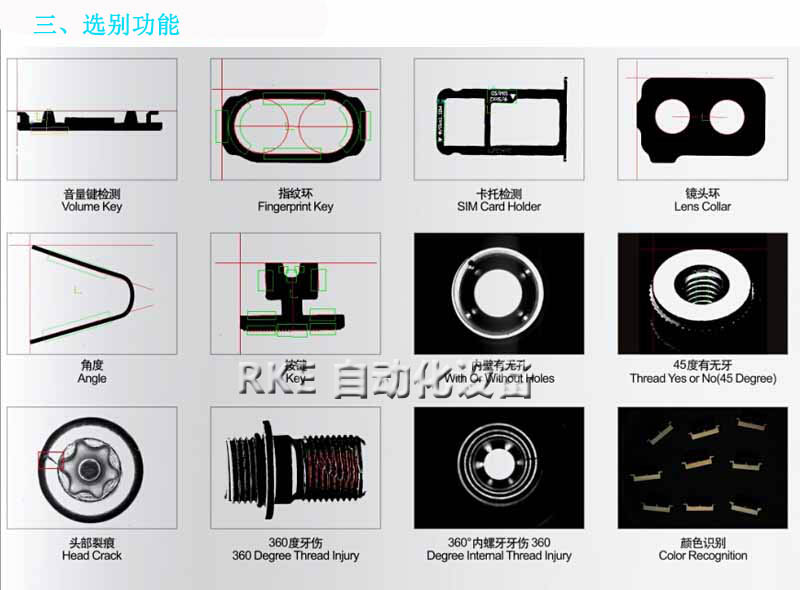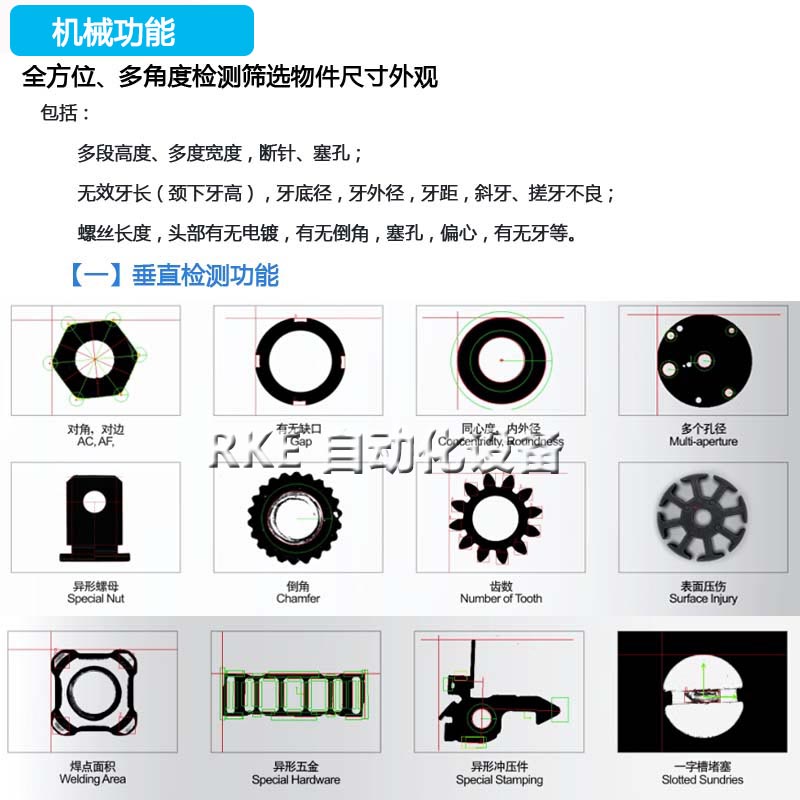 主要是檢測(cè)螺絲頭部直徑、多段高度頭厚、十字塞孔、頭裂、牙外徑、牙距、牙高度、牙角度、斜牙、外裂、側(cè)裂等。 |